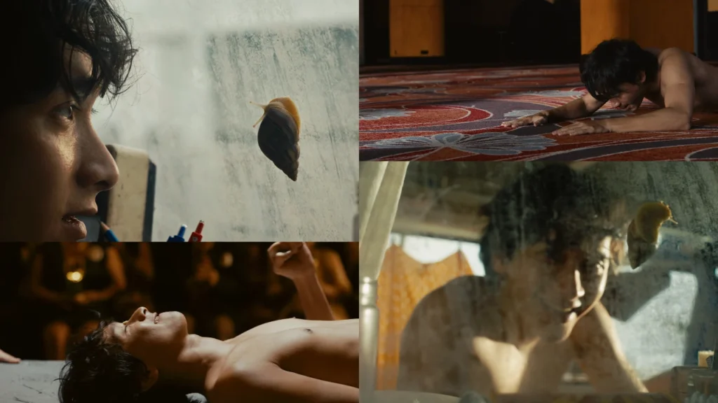 Tình huống này không chỉ mang tính siêu thực mà còn là một ẩn dụ đau đớn cho thân phận của người trẻ trong kỷ nguyên hiện đại. Huy, dù là nhân vật trung tâm của buổi trình diễn, lại hoàn toàn bị động và bị vật hóa. Anh bị thuê mướn để trở thành một vật mẫu, một bối cảnh cho cuộc đua của những con ốc sên. Vị thế “diễn viên quần chúng” của Huy được khắc họa rõ nét: anh phải chịu đựng sự xấu hổ, tò mò, và những ham muốn bị kìm nén của chính mình để đổi lấy một khoảnh khắc được chú ý.