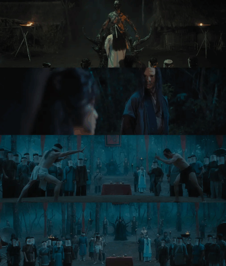 Chỉ hơn một phút, trailer đã khiến khán giả “nín thở” với loạt cảnh tượng rùng rợn: dân làng bị yểm bùa hóa quỷ, lễ đấu vật đẫm máu, xác người chồng chất và những nghi lễ triệu hồi hắc ám. Bên cạnh đó, khoảnh khắc cô đồng Đào Trúc Anh mê hoặc Thân Đức trong làn khói hư ảo khiến người xem đặt câu hỏi: liệu kẻ trừ tà có đang dần bị quỷ dữ thao túng?