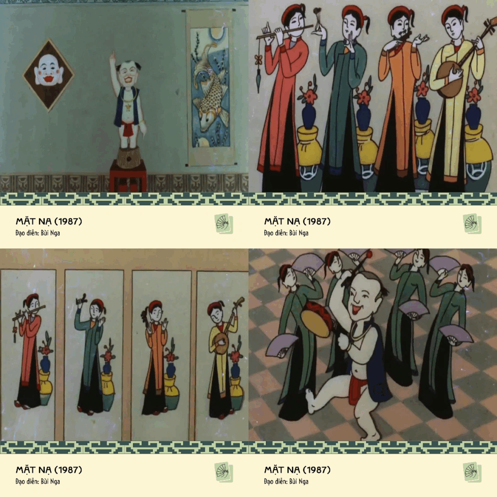 Đầu tiên phải kể đến sự uyển chuyển của Tranh Hàng Trống. Với kỹ thuật “vờn màu” (nửa in nửa vẽ) độc đáo, tranh Hàng Trống vốn dĩ đã có khả năng tạo chiều sâu 3D trên mặt phẳng 2D. Tác phẩm “Mặt nạ” (1987) là minh chứng rõ nhất cho sự thành công này. Bộ phim đã sử dụng kỹ thuật kết hợp giữa cắt giấy và vẽ tay để khiến các hình ảnh như cô Tố Nữ hay cá chép bước ra khỏi tranh một cách sống động, rực rỡ sắc màu và nhịp nhàng.